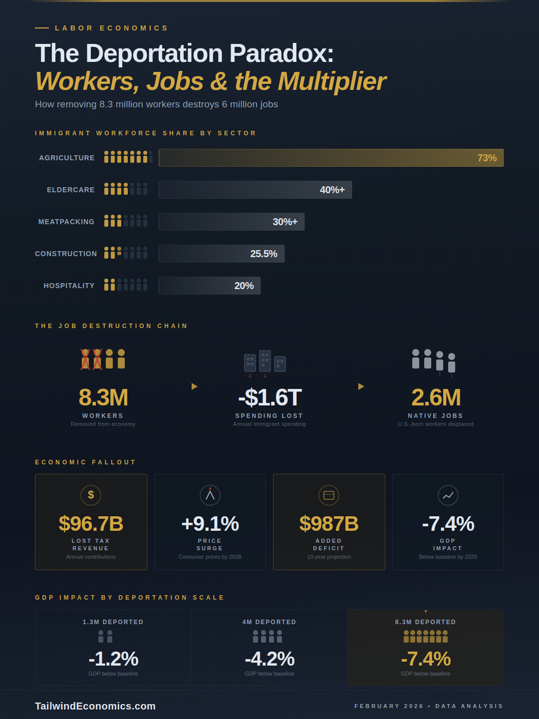 Q: How many jobs would mass deportation eliminate in the U.S.? A: The Economic Policy Institute estimates deporting 4 million undocumented workers would eliminate nearly 6 million total jobs — approximately 3.3 million immigrant positions and 2.6 million U.S.-born positions. The losses cascade through complementary labor relationships: for every immigrant construction worker deported, roughly 0.32 native-born construction workers also lose employment.