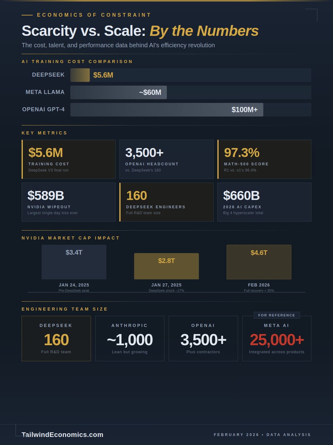 A Chinese AI lab with 160 engineers, banned from buying top-tier chips, built a model that matched OpenAI's best — for roughly $5.6 million. That single achievement forced a $589 billion single-day wipeout of NVIDIA's market cap and triggered what venture capitalist Marc Andreessen called "AI's Sputnik moment." The DeepSeek story is not an anomaly. It is the latest and most dramatic confirmation of a principle economists have studied for decades: resource scarcity, when paired with ingenuity, does not constrain innovation — it accelerates it.