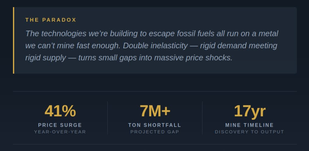 The economic theory cuts both ways. Copper demand and supply are both highly inelastic in the short run — an IMF study found that a 10% demand-driven price shock increases same-year output by only 3.5%. This double inelasticity explains why small imbalances produce outsized price swings. But it also means that sustained high prices will eventually activate substitution, scrap recovery (already 30–35% of U.S. supply), and new investment — the self-correcting mechanism that has historically prevented permanent scarcity.