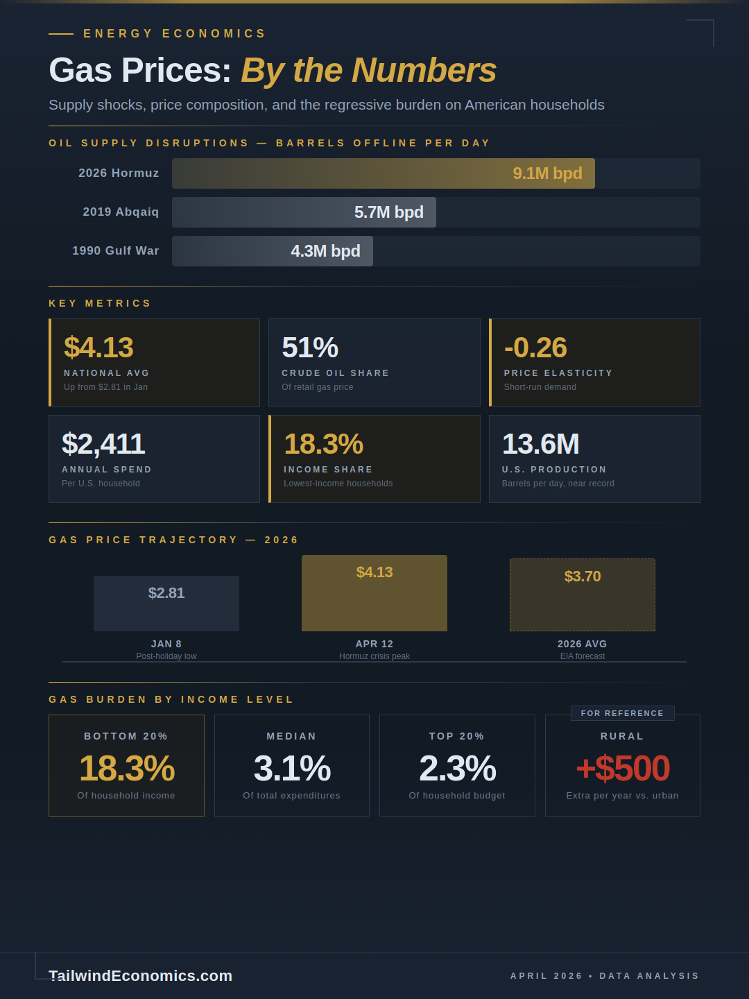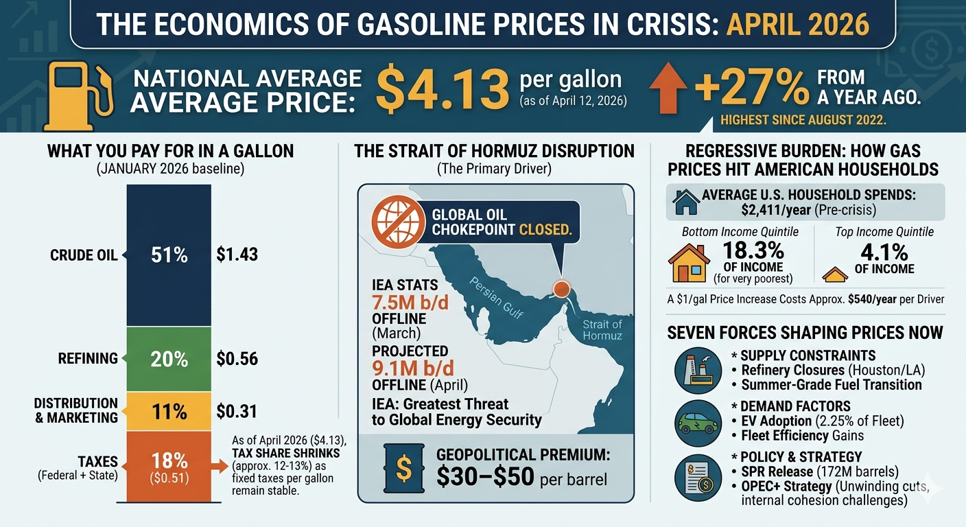 American drivers are paying $4.13 per gallon for regular gasoline as of April 12, 2026 — up 27% from a year ago and the highest since August 2022 — driven primarily by the largest oil supply disruption in modern history. The U.S.-Israeli military campaign against Iran and the subsequent closure of the Strait of Hormuz have injected a $30–$50 per barrel geopolitical premium into crude oil, transforming what was shaping up to be a year of sub-$3 gasoline into a potential repeat of the 2022 price shock. For the average American household spending $2,411 annually on fuel, this surge functions as a deeply regressive tax — consuming nearly one-fifth of the poorest households' income while barely registering for the wealthiest. Understanding why gasoline costs what it does requires examining the interplay of crude oil markets, refinery economics, OPEC+ cartel strategy, and the unique demand characteristics that make gasoline one of the most economically significant commodities in daily life.