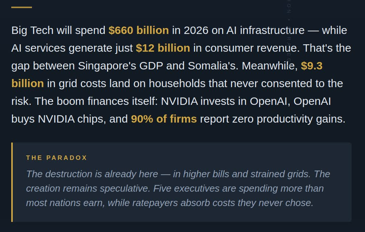 Joseph Schumpeter argued that capitalism advances through "creative destruction" — waves of innovation that render old structures obsolete while building new ones. The AI infrastructure buildout fits this framework, but with a crucial caveat: the destruction is already materializing in higher bills and strained grids, while the creation remains largely speculative. Total U.S. AI capital expenditures are projected to exceed $500 billion annually in 2026 and 2027 — roughly the GDP of Singapore. American consumers spend approximately $12 billion per year on AI services — roughly the GDP of Somalia. If you can grasp the economic distance between Singapore and Somalia, you understand the chasm between vision and reality.