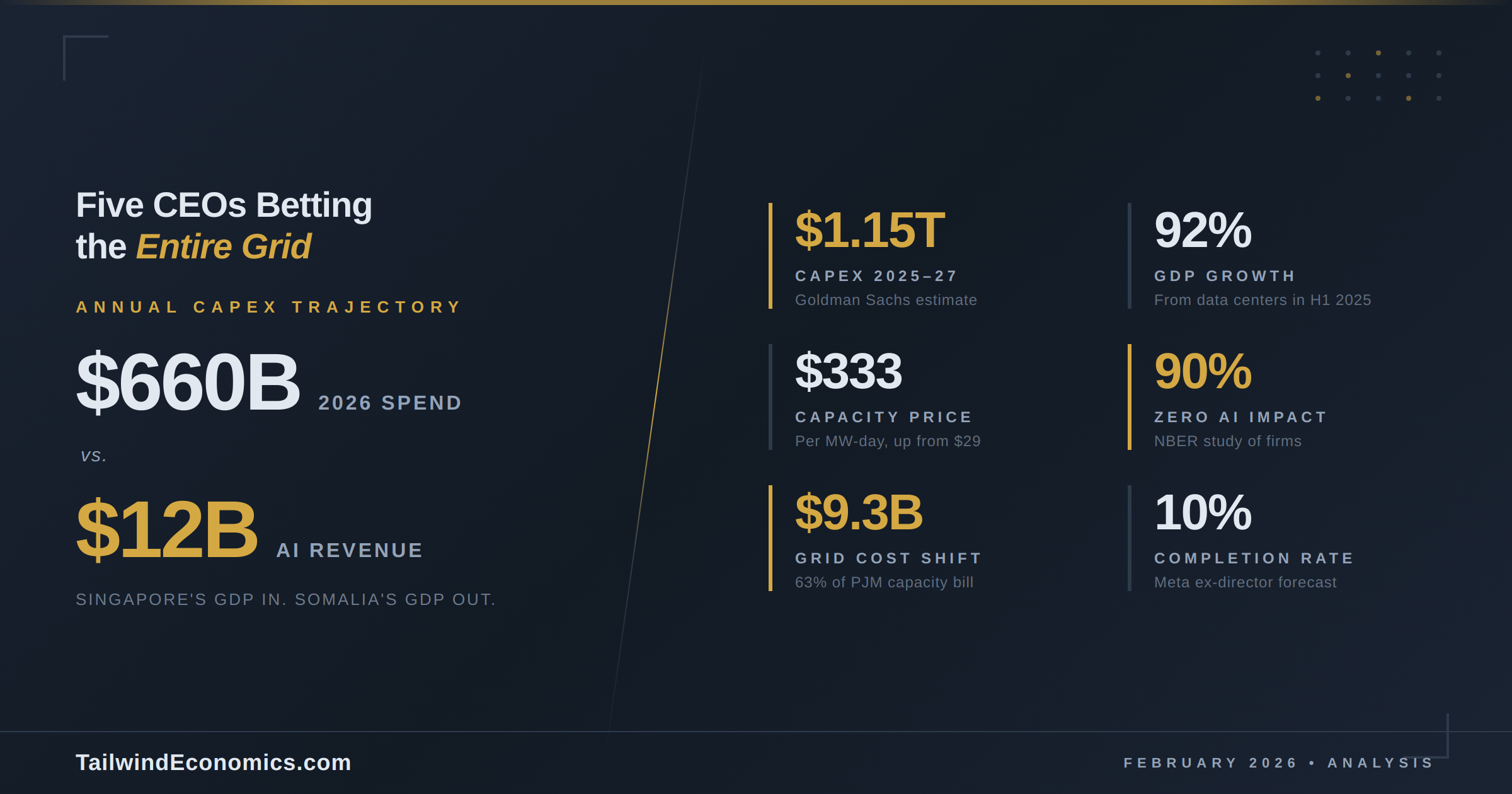 Five tech CEOs are orchestrating the largest private infrastructure buildout in American history, and ordinary ratepayers are footing part of the bill. The Big Five hyperscalers — Amazon, Alphabet, Microsoft, Meta, and Oracle — spent roughly $256 billion on capital expenditure in 2024 and have guided toward $380–$443 billion in 2025, with combined 2026 commitments now approaching $660 billion. Goldman Sachs projects cumulative hyperscaler capex of $1.15 trillion for 2025–2027 alone, more than double the prior three years. To put this in context, Big Tech capex as a share of U.S. GDP now rivals the combined scale of the interstate highway system, the Apollo program, and broadband deployment. Harvard economist Jason Furman calculates that data center investment contributed 92 percent of U.S. GDP growth in the first half of 2025 — strip it out, and annualized growth collapses to 0.1 percent. America's economic engine is, for the moment, running on GPUs.