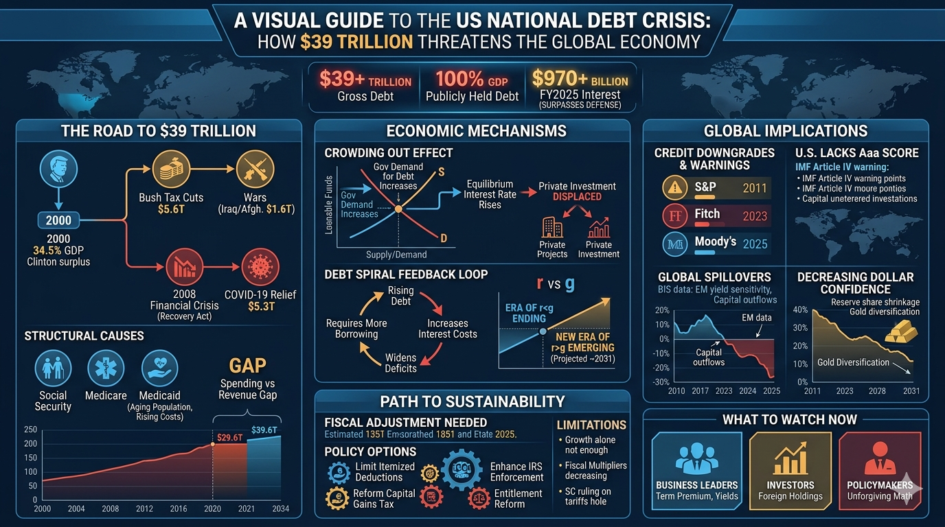 The United States is borrowing its way into a fiscal trap that threatens both domestic prosperity and global financial stability. With gross national debt surpassing $39 trillion in early 2026 and debt held by the public reaching 100% of GDP for the first time since World War II, the country's fiscal trajectory has shifted from a distant concern to an immediate risk factor in global markets. The IMF, all three major credit rating agencies, and Federal Reserve Chair Jerome Powell have issued escalating warnings, yet Washington continues to legislate in the opposite direction.